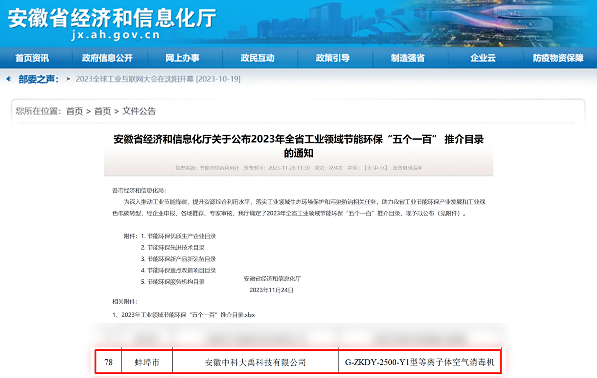 • 入選2023年全省工業(yè)領(lǐng)域節(jié)能環(huán)保“五個(gè)一百”推介目錄(節(jié)能環(huán)保新產(chǎn)品新裝備:G-ZKDY-2500-Y1型等離子體空氣消毒機(jī))